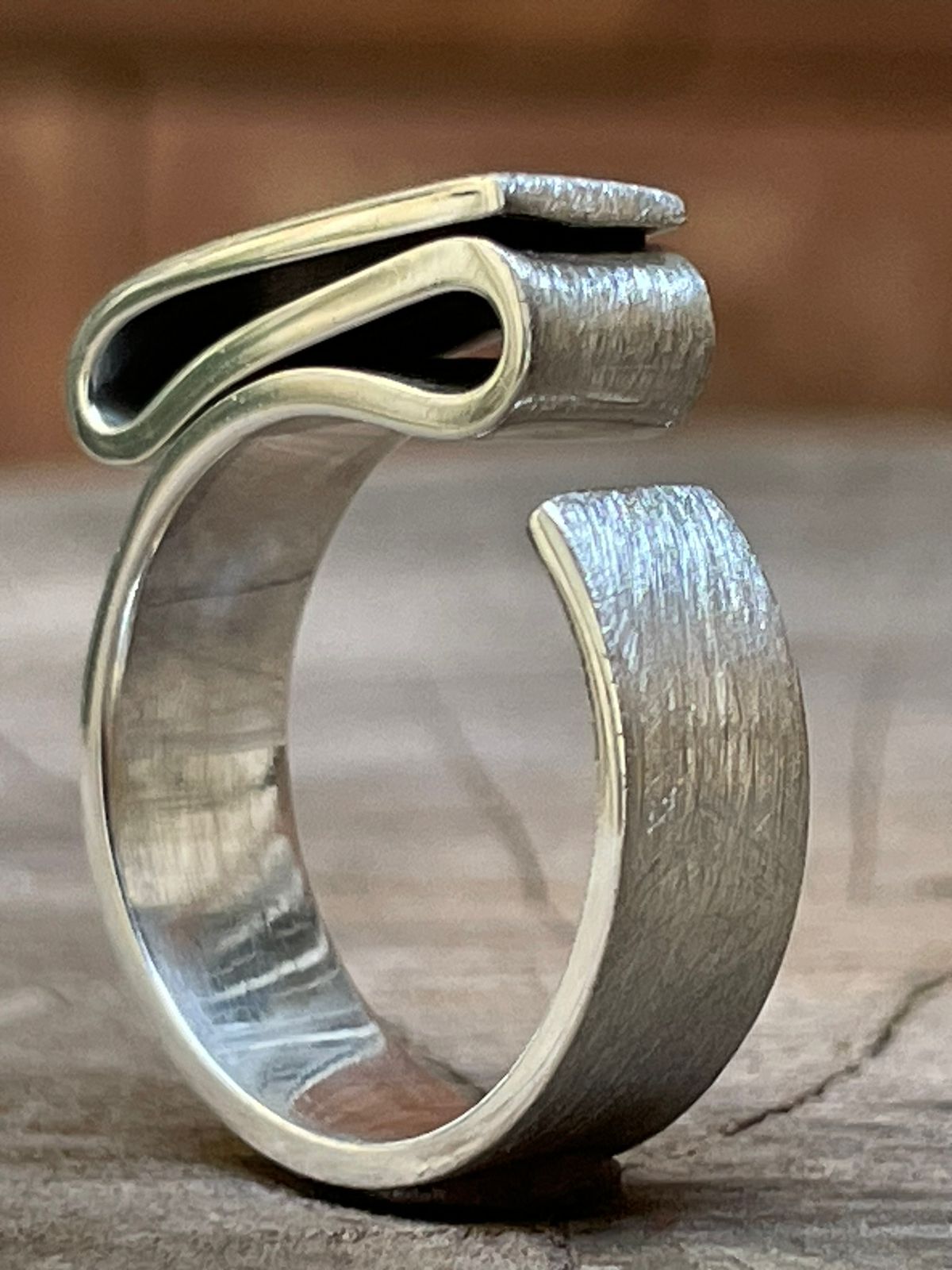 Anel em prata com design contemporâneo, formado por linhas que se dobram e se sobrepõem como fitas em movimento. Uma peça leve, marcante e elegante, que valoriza a fluidez das formas e o acabamento artesanal. Ideal para quem busca um acessório moderno e atemporal.