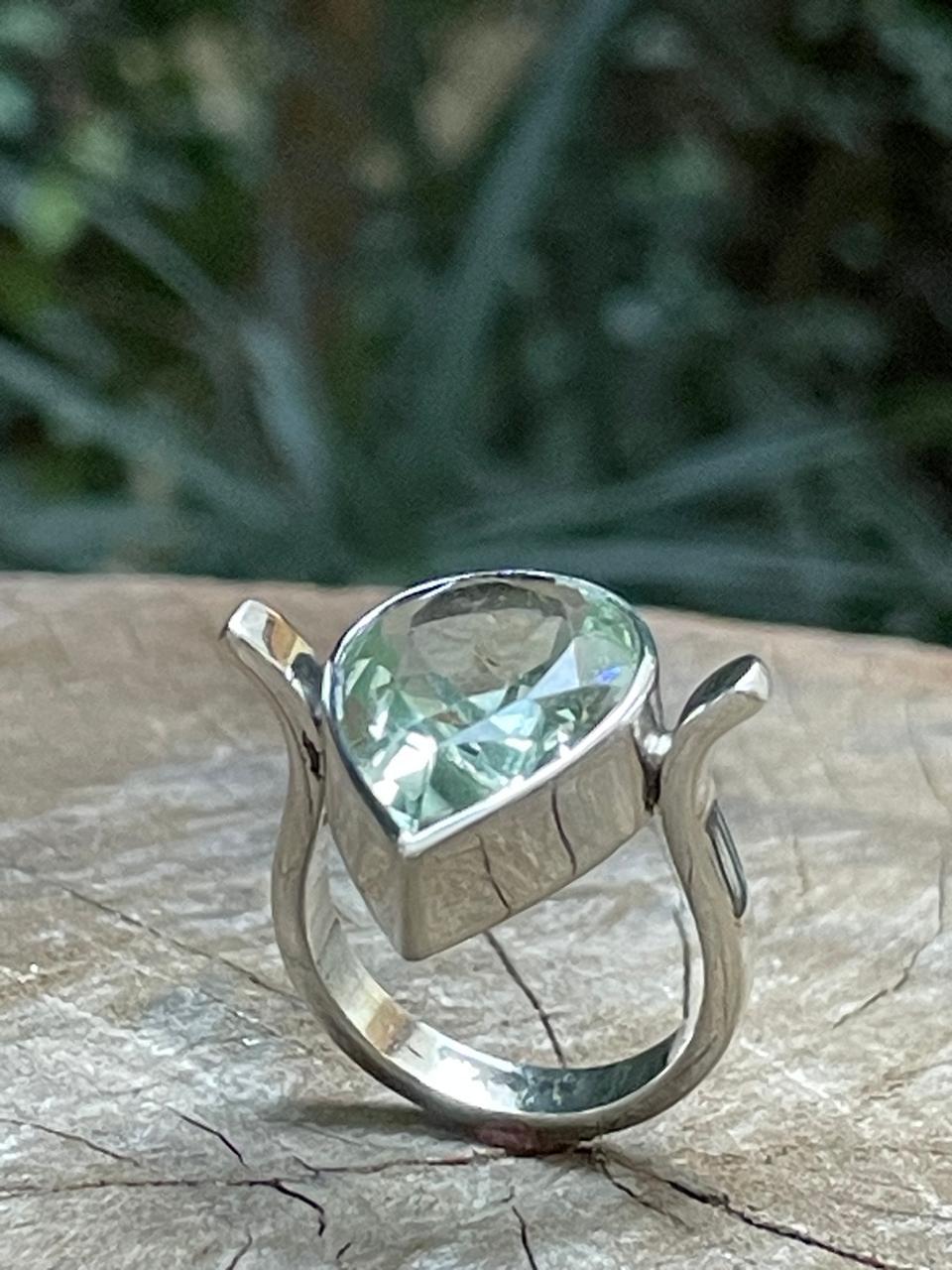 O Anel Isis é forjado em prata 950 e abraça com delicadeza um berilo natural, gema semipreciosa que reflete luz e cor em cada movimento.