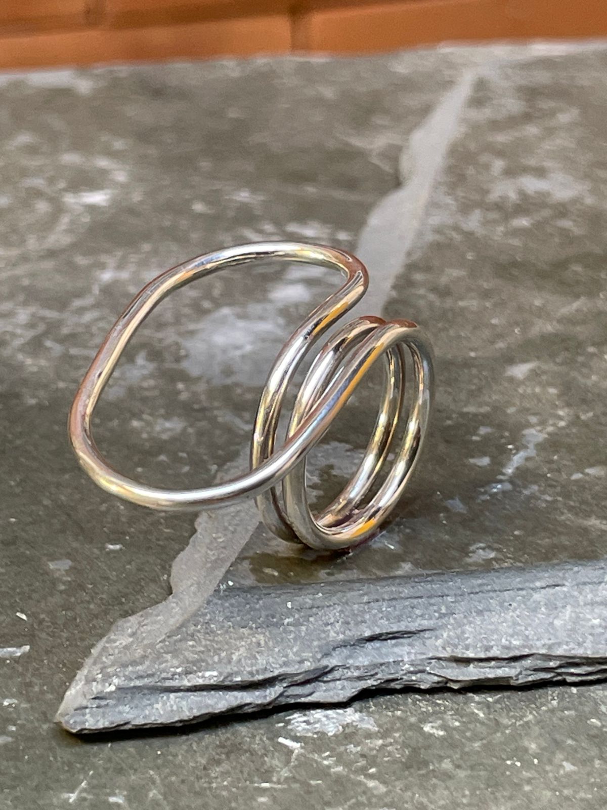 Anel em prata com formas orgânicas e linhas suaves que se entrelaçam de maneira natural. Seu design fluido remete ao movimento contínuo e à imperfeição harmoniosa da natureza, resultando em uma peça leve, contemporânea e atemporal.