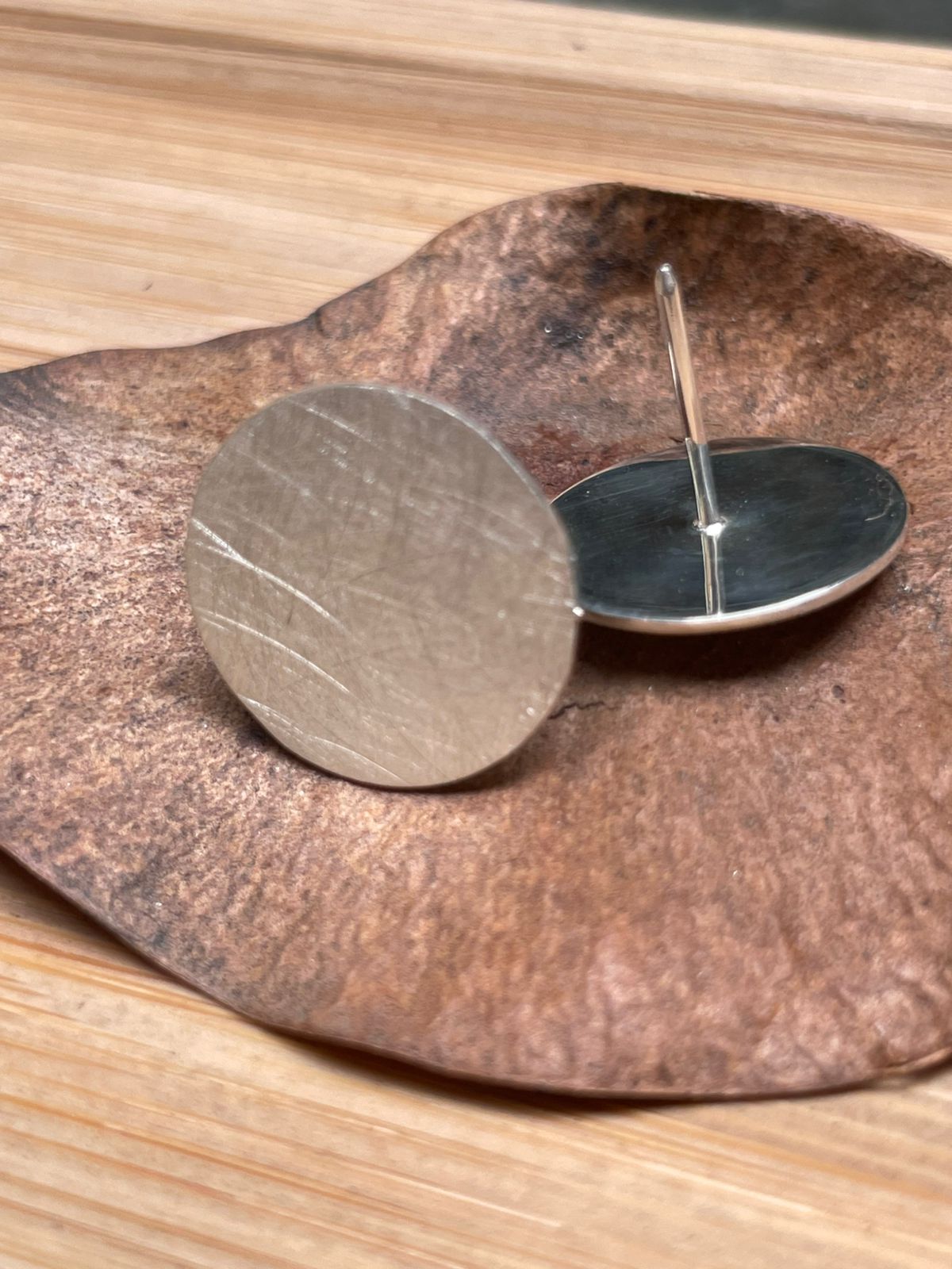 O encontro entre luz e sombra em um brinco de disco de prata texturizado ou polido. Um amuleto moderno que simboliza ciclos e renovação.